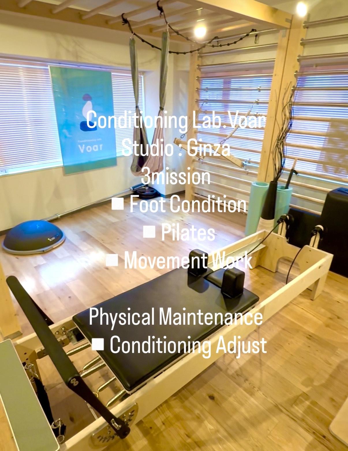 足環境のチェック・重心確認をしっかり行い、Voar独自の3つのトレーニング(フット系・ピラティス系・ムーブメントワーク)の中から最適なプログラムを組み合わせてでトレーニングしていきます。
